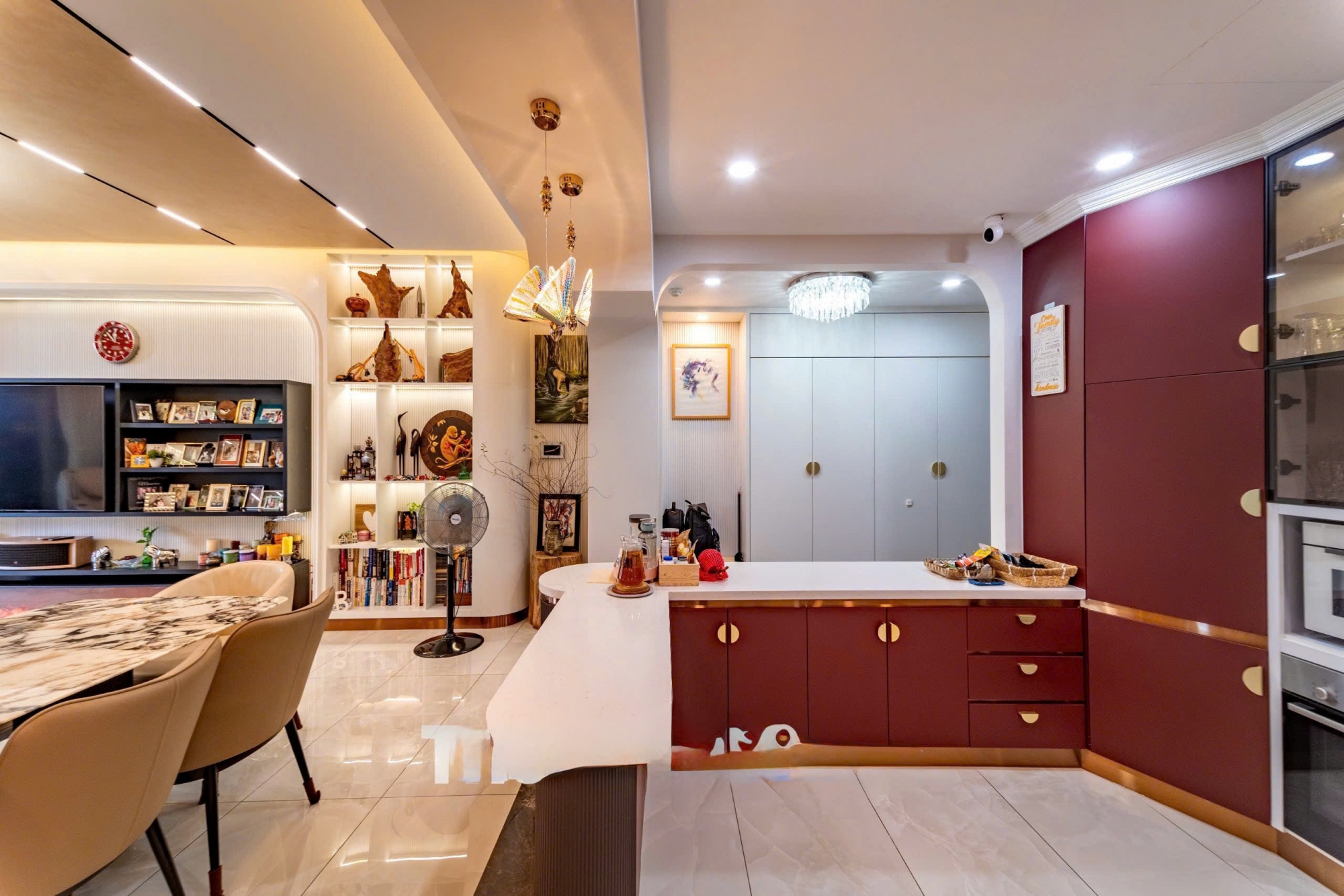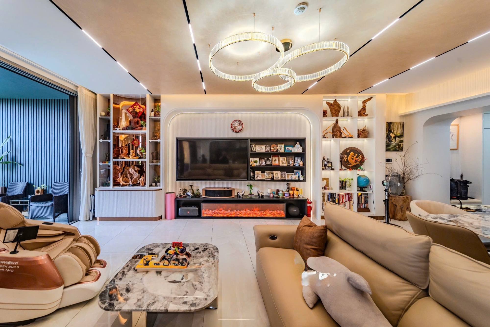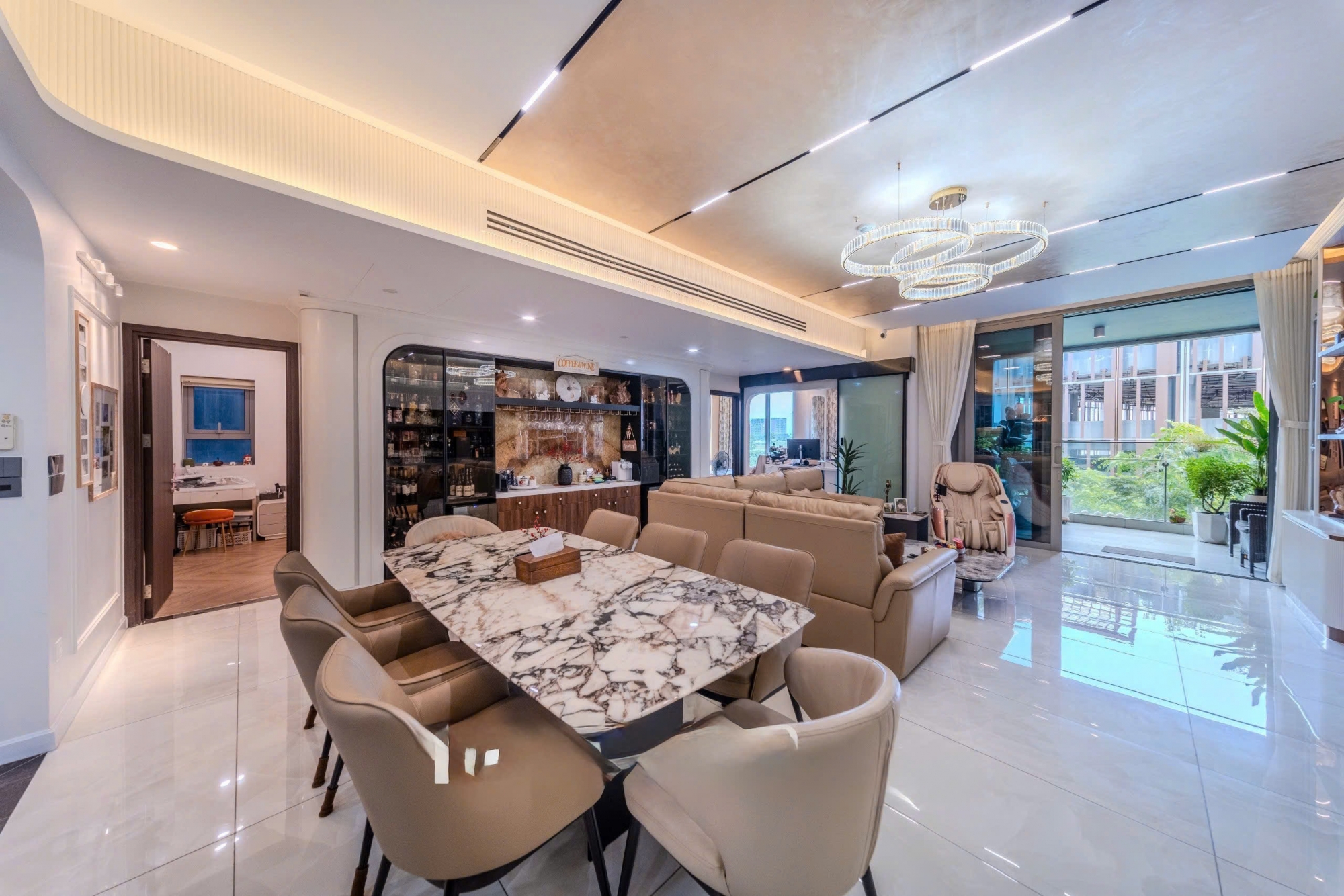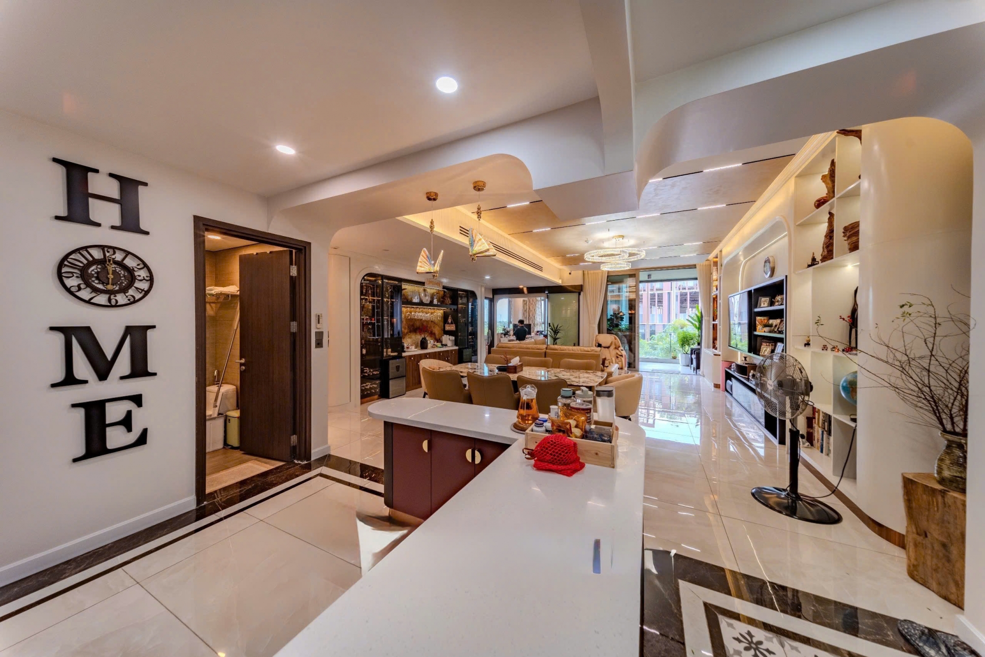 Căn hộ sở hữu thiết kế hiện đại, bố cục thông minh với diện tích rộng rãi, mang lại cảm giác thoáng đãng và thoải mái cho mọi sinh hoạt hằng ngày. Phòng khách lớn kết nối liền mạch với khu bếp và bàn ăn, tạo nên không gian sinh hoạt chung ấm cúng nhưng vẫn vô cùng đẳng cấp.