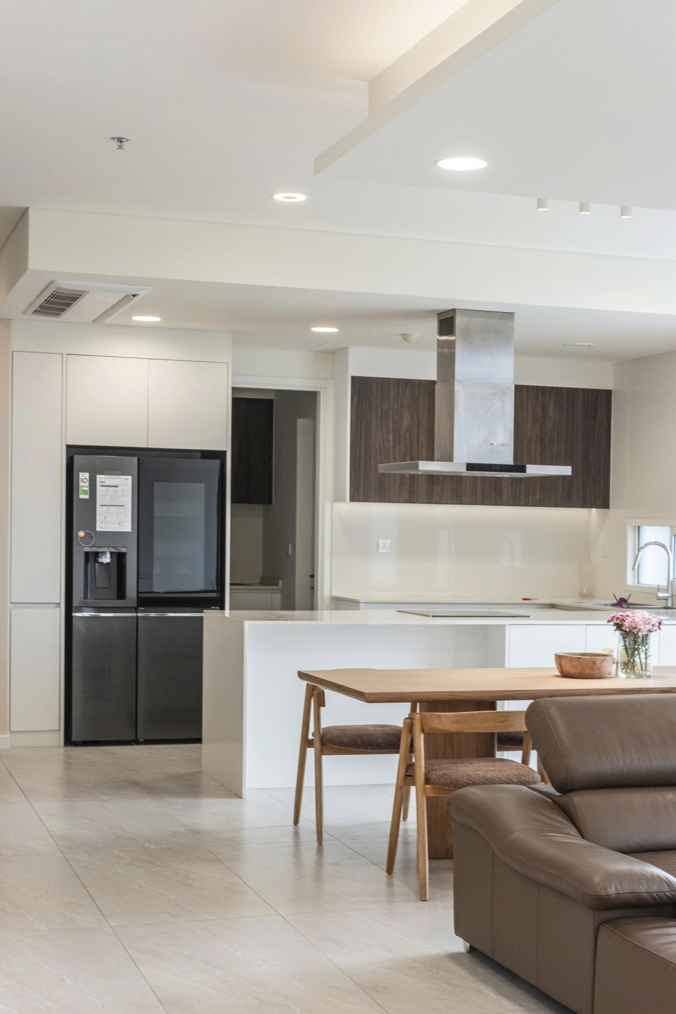 • Không gian phòng khách lớn, trần cao, kết nối hài hòa với khu bếp và bàn ăn
