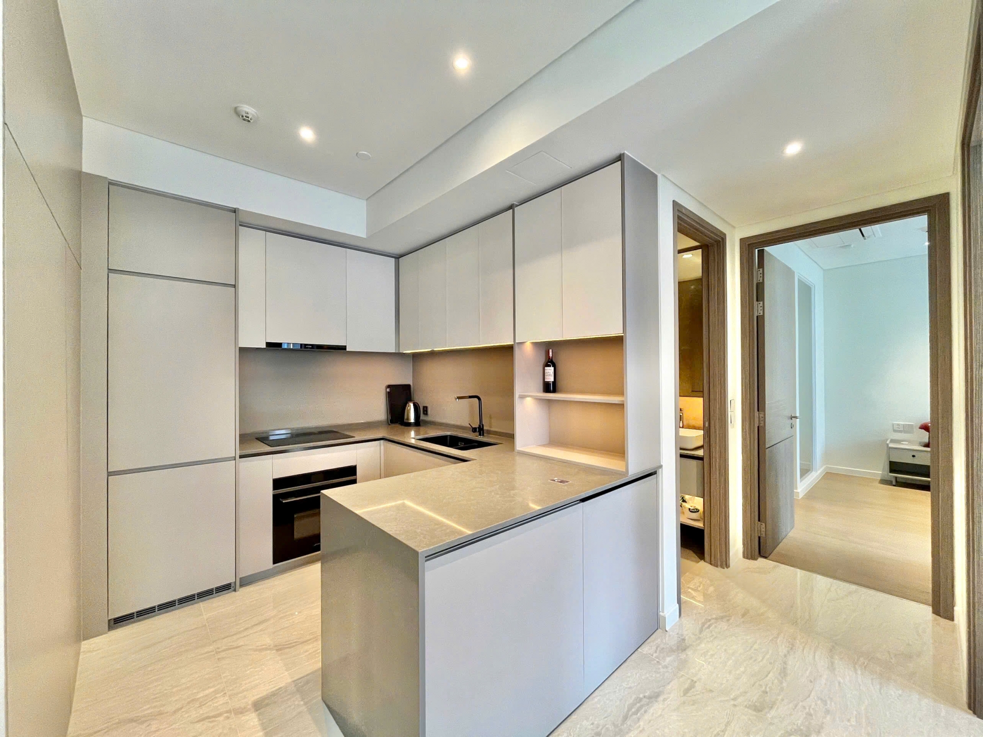 • Khu bếp mở với hệ tủ thiết kế tinh tế, đầy đủ thiết bị điện tử hiện đại