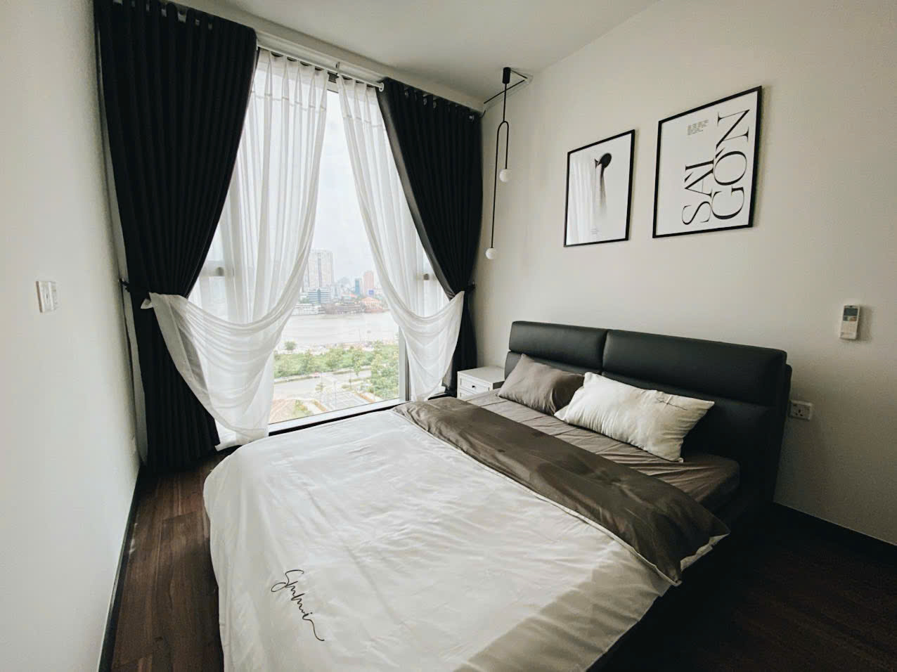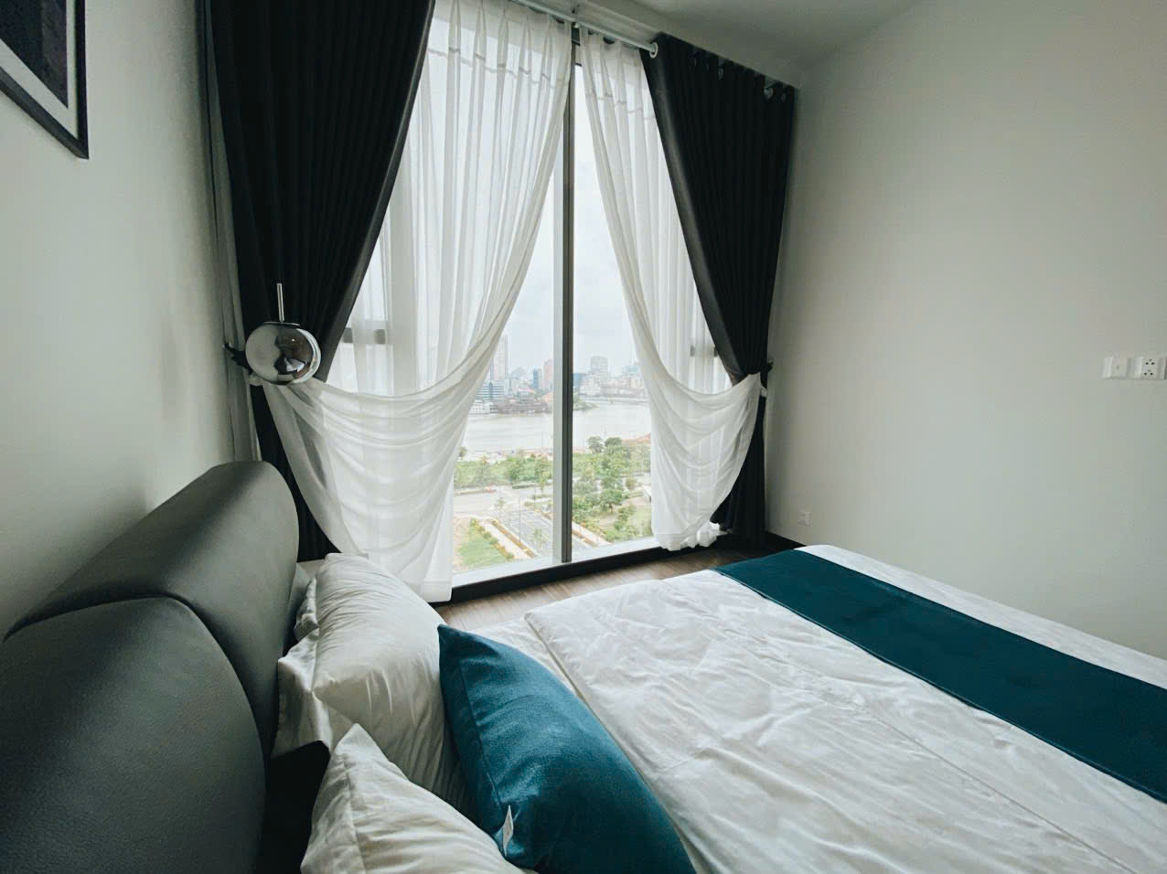 Căn hộ thiết kế 2 phòng ngủ, bố trí hợp lý với phòng khách rộng rãi liên thông khu bếp. Ban công thoáng mang đến view sông và Quận 1, tầm nhìn đẹp cả ngày lẫn ban đêm. Nội thất được trang bị đầy đủ theo phong cách hiện đại, tiện nghi, khách thuê chỉ cần mang vali vào ở.