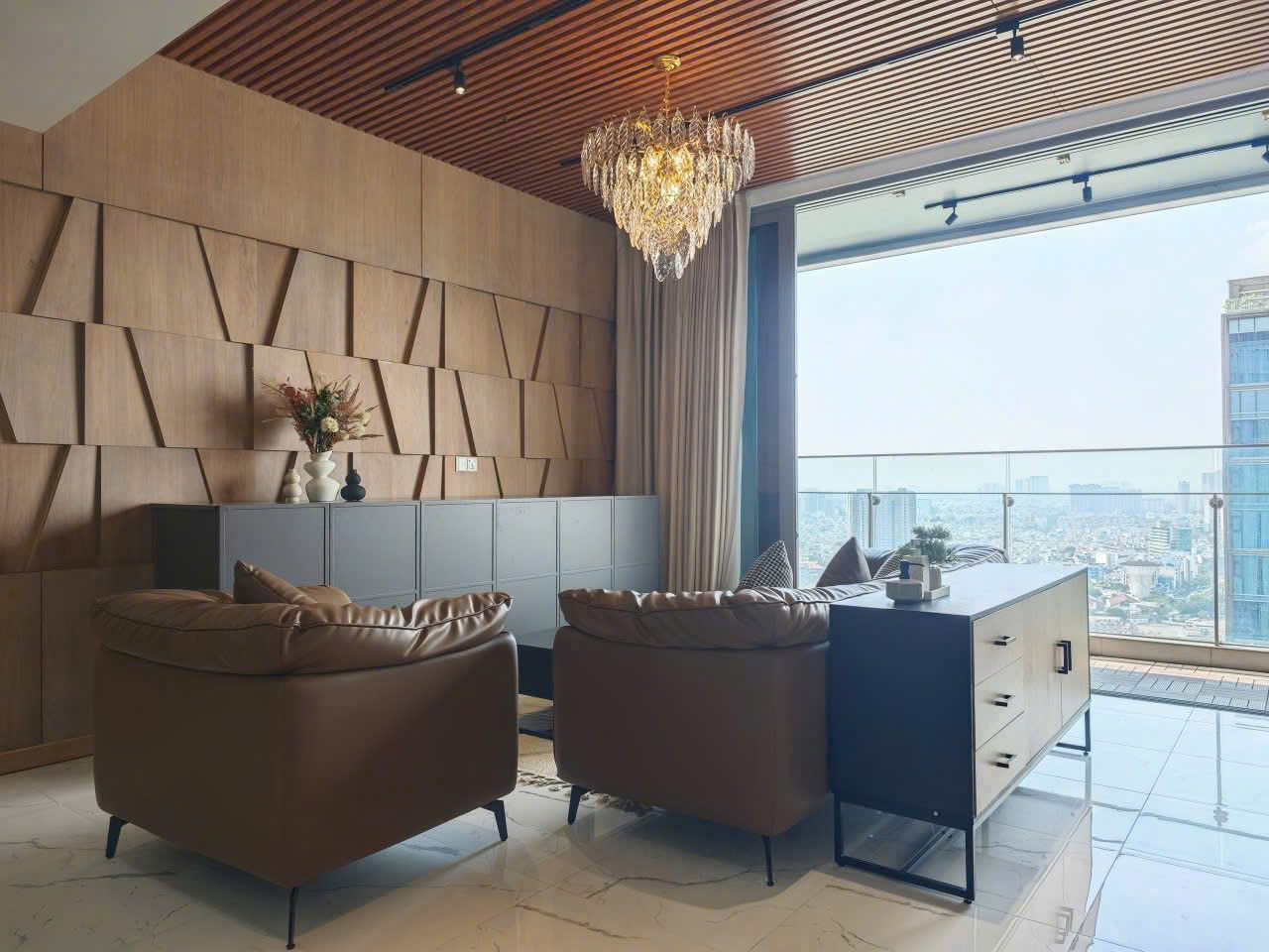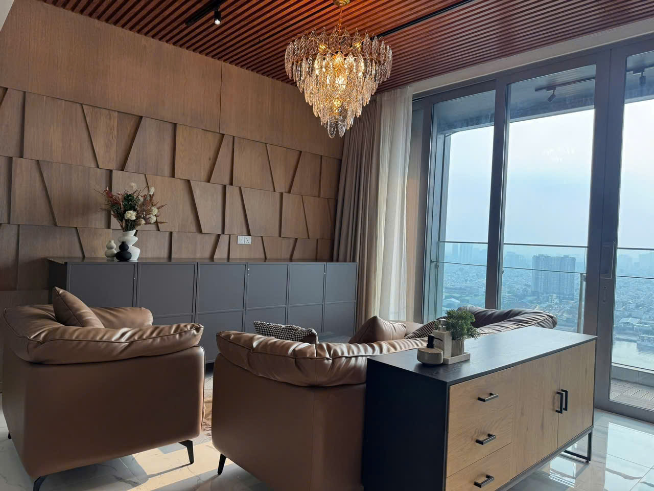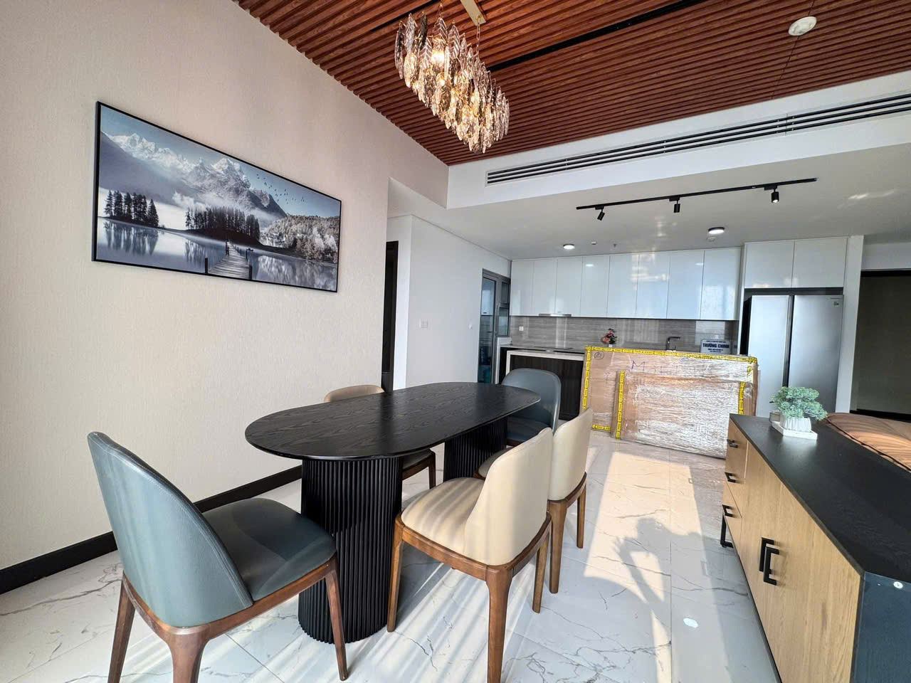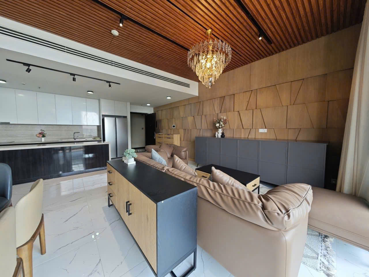 Nội thất được trang bị cao cấp với phong cách sang trọng tinh tế Trần gỗ kết hợp hệ đèn chùm tạo điểm nhấn ấn tượng cho không gian sinh hoạt Khu bếp mở bố trí gọn gàng tích hợp đầy đủ thiết bị hiện đại phù hợp cho sinh hoạt gia đình
