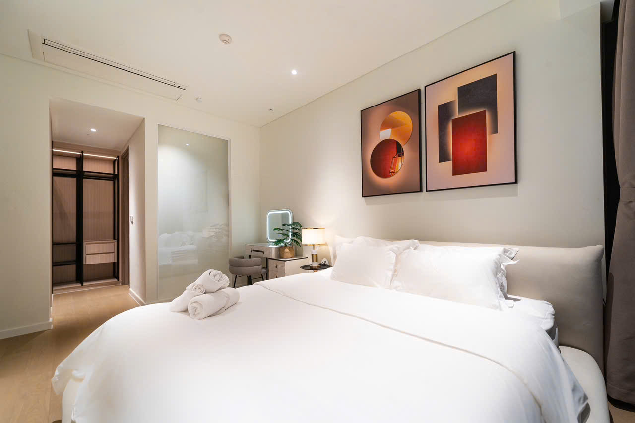 Hai phòng ngủ được bố trí hợp lý, đảm bảo sự riêng tư tuyệt đối. Phòng ngủ master rộng rãi, nội thất cao cấp, mang lại cảm giác thư giãn chuẩn khách sạn 5 sao. Hệ thống bếp hiện đại với thiết bị nhập khẩu, sẵn sàng cho sinh hoạt hằng ngày.