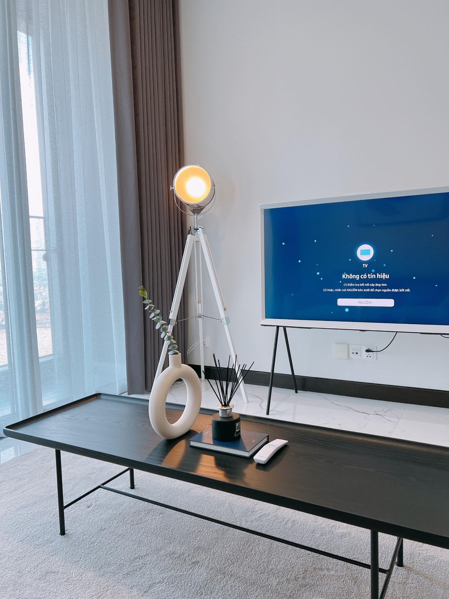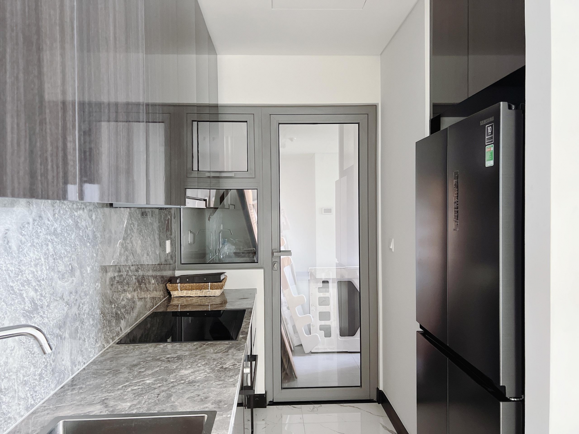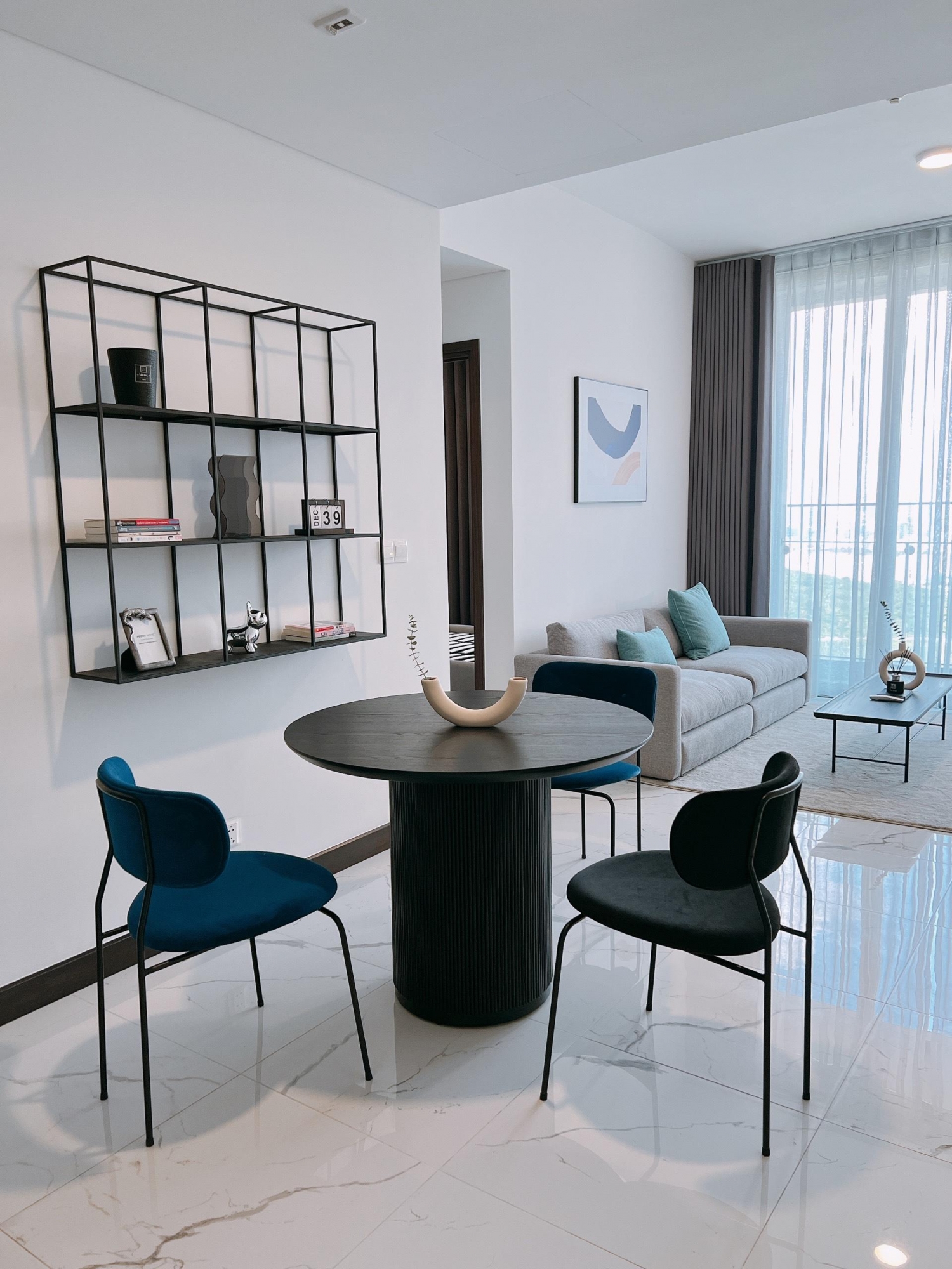 Không gian được thiết kế theo phong cách hiện đại, tối giản nhưng tinh tế. Phòng khách bố trí sofa êm ái, bàn trà, thảm trang trí cùng hệ đèn chiếu sáng hài hòa tạo cảm giác ấm cúng. Khu bếp mở được trang bị đầy đủ thiết bị như tủ lạnh, bếp điện, máy hút mùi, lò vi sóng và hệ tủ bếp âm tường gọn gàng, tối ưu công năng sử dụng.