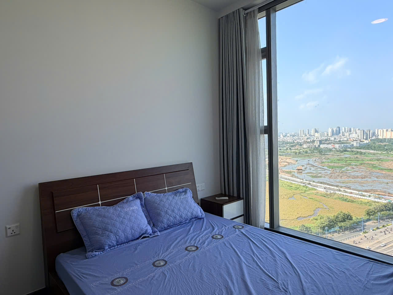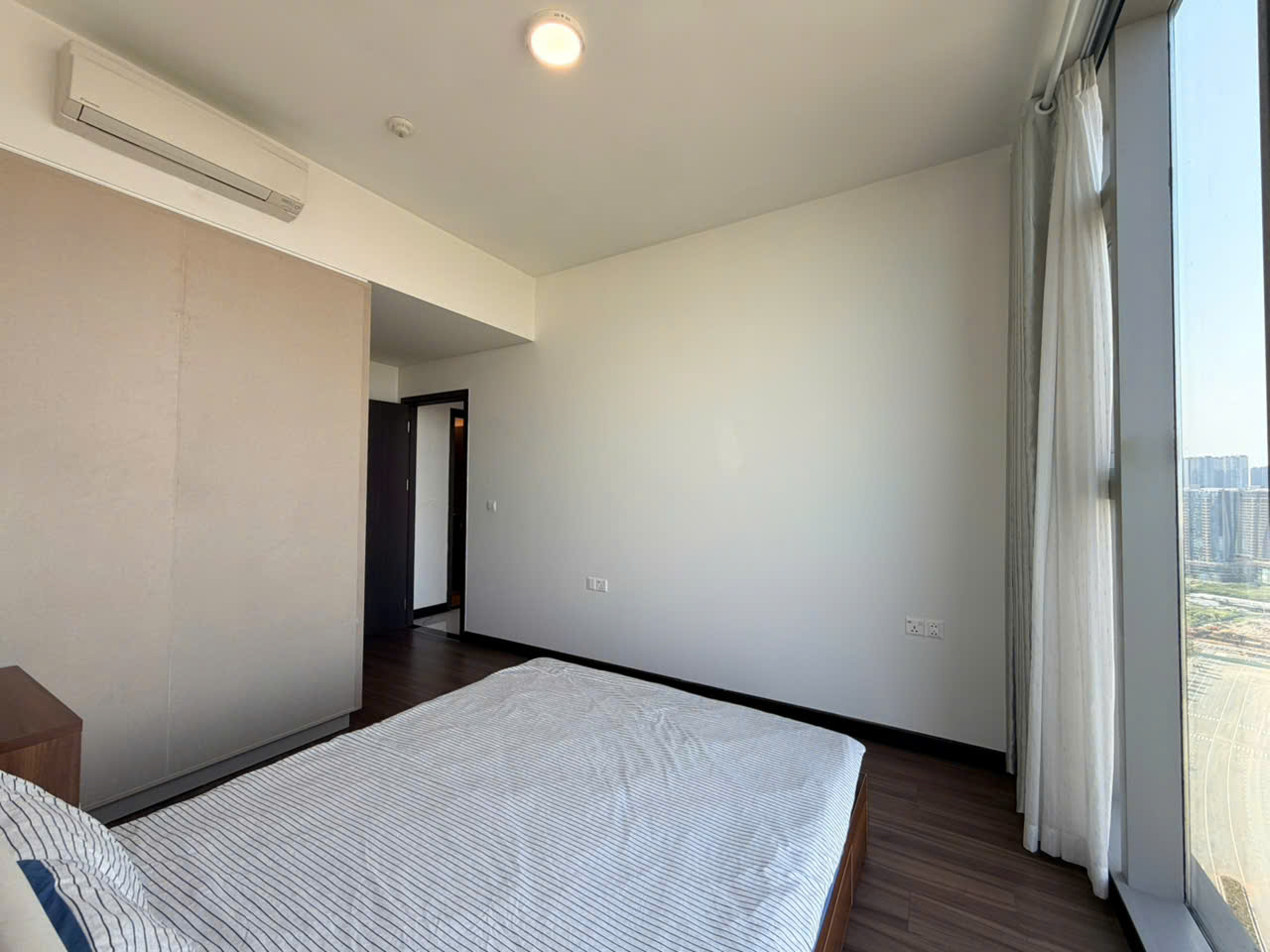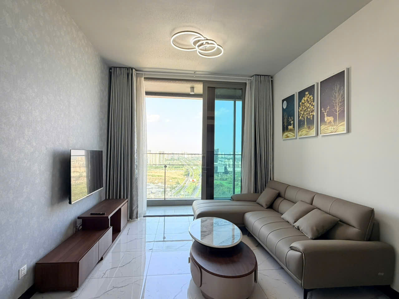 Căn hộ được thiết kế 2 phòng ngủ với bố cục hợp lý, tối ưu không gian sử dụng. Phòng khách rộng rãi kết nối với khu bếp mở, tạo nên không gian sinh hoạt chung thông thoáng và tiện nghi. Hệ cửa kính lớn giúp đón ánh sáng tự nhiên, mang lại cảm giác sáng sủa và dễ chịu. Ban công sở hữu view thoáng, nhìn ra cảnh quan thành phố và mảng xanh xung quanh, mang lại không gian thư giãn lý tưởng sau một ngày làm việc.