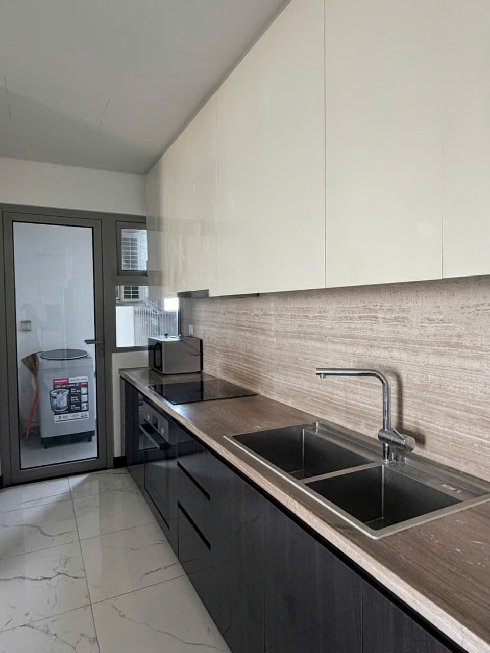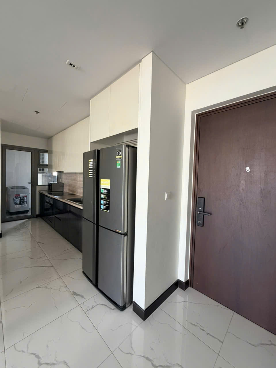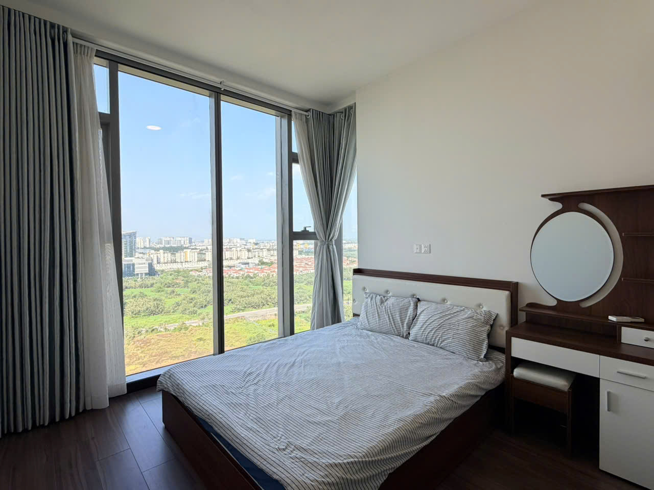 Căn hộ được thiết kế 2 phòng ngủ với bố cục hợp lý, tối ưu không gian sử dụng. Phòng khách rộng rãi kết nối với khu bếp mở, tạo nên không gian sinh hoạt chung thông thoáng và tiện nghi. Hệ cửa kính lớn giúp đón ánh sáng tự nhiên, mang lại cảm giác sáng sủa và dễ chịu. Ban công sở hữu view thoáng, nhìn ra cảnh quan thành phố và mảng xanh xung quanh, mang lại không gian thư giãn lý tưởng sau một ngày làm việc.