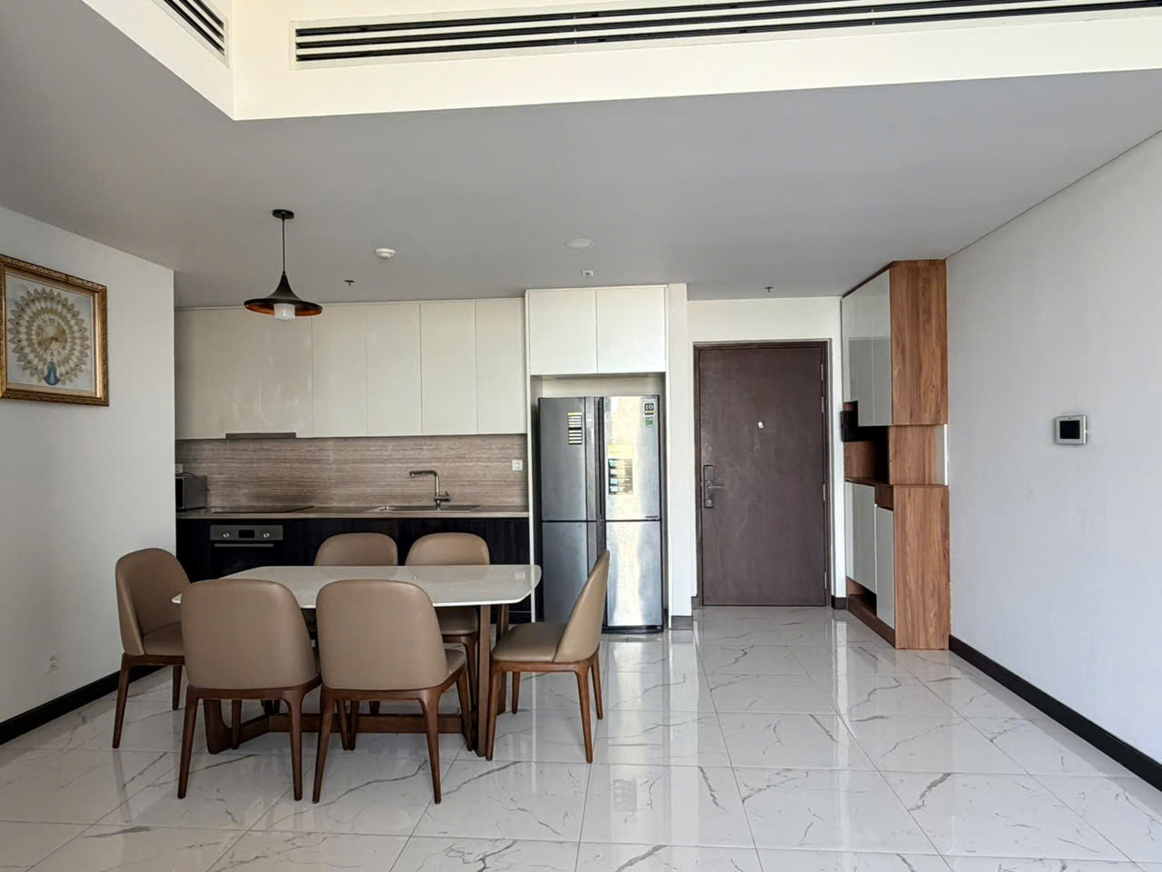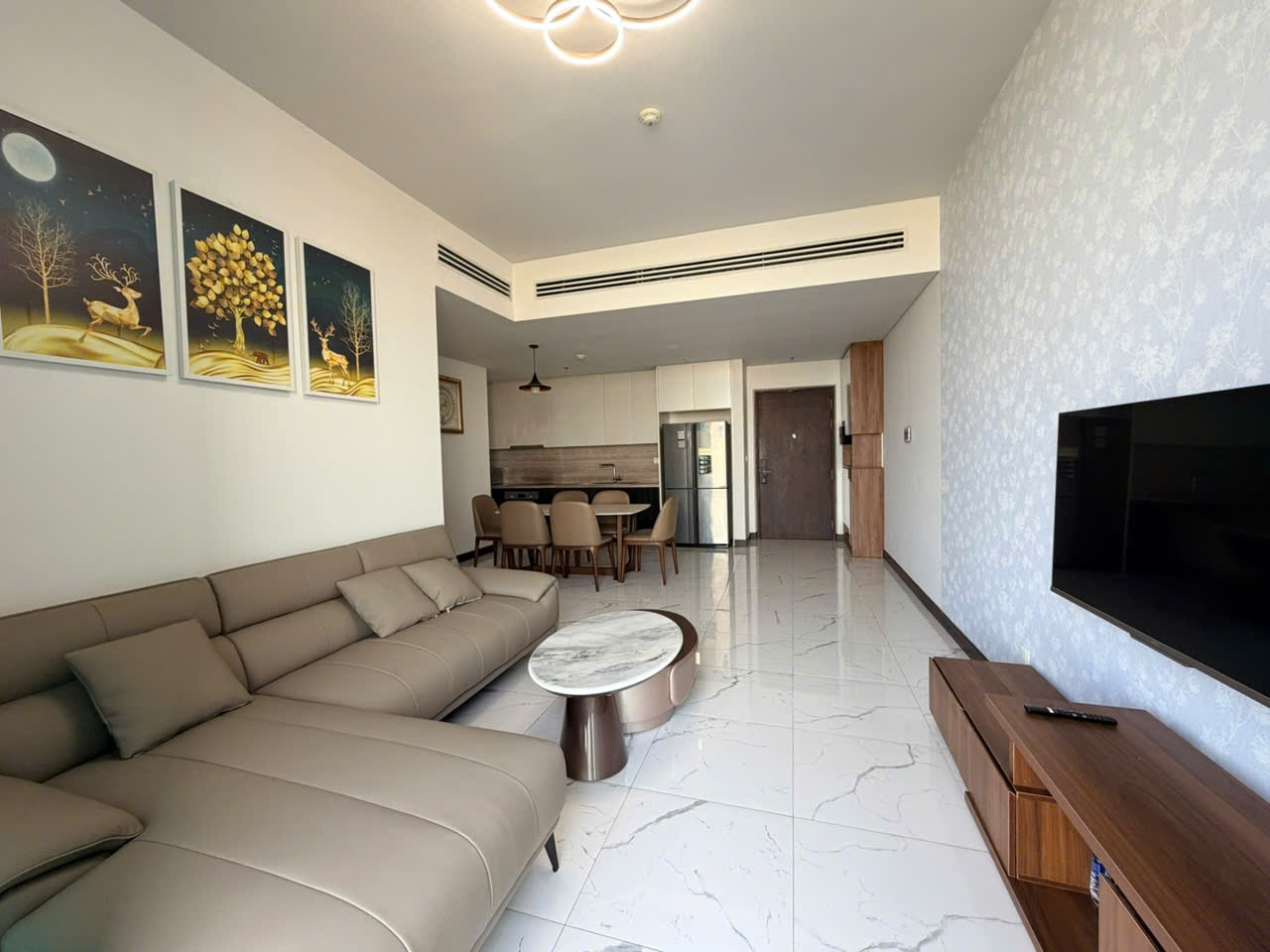 Căn hộ được trang bị đầy đủ nội thất hiện đại như sofa, bàn ăn, giường ngủ, tủ quần áo, máy lạnh, tivi và hệ thống bếp. Tất cả được bố trí hài hòa, sẵn sàng cho khách thuê dọn vào ở ngay.