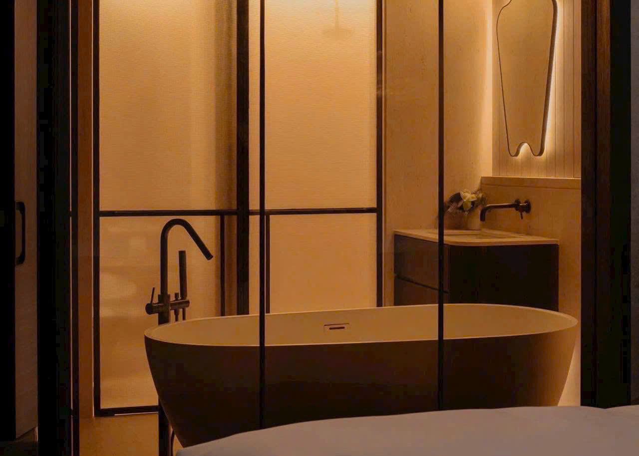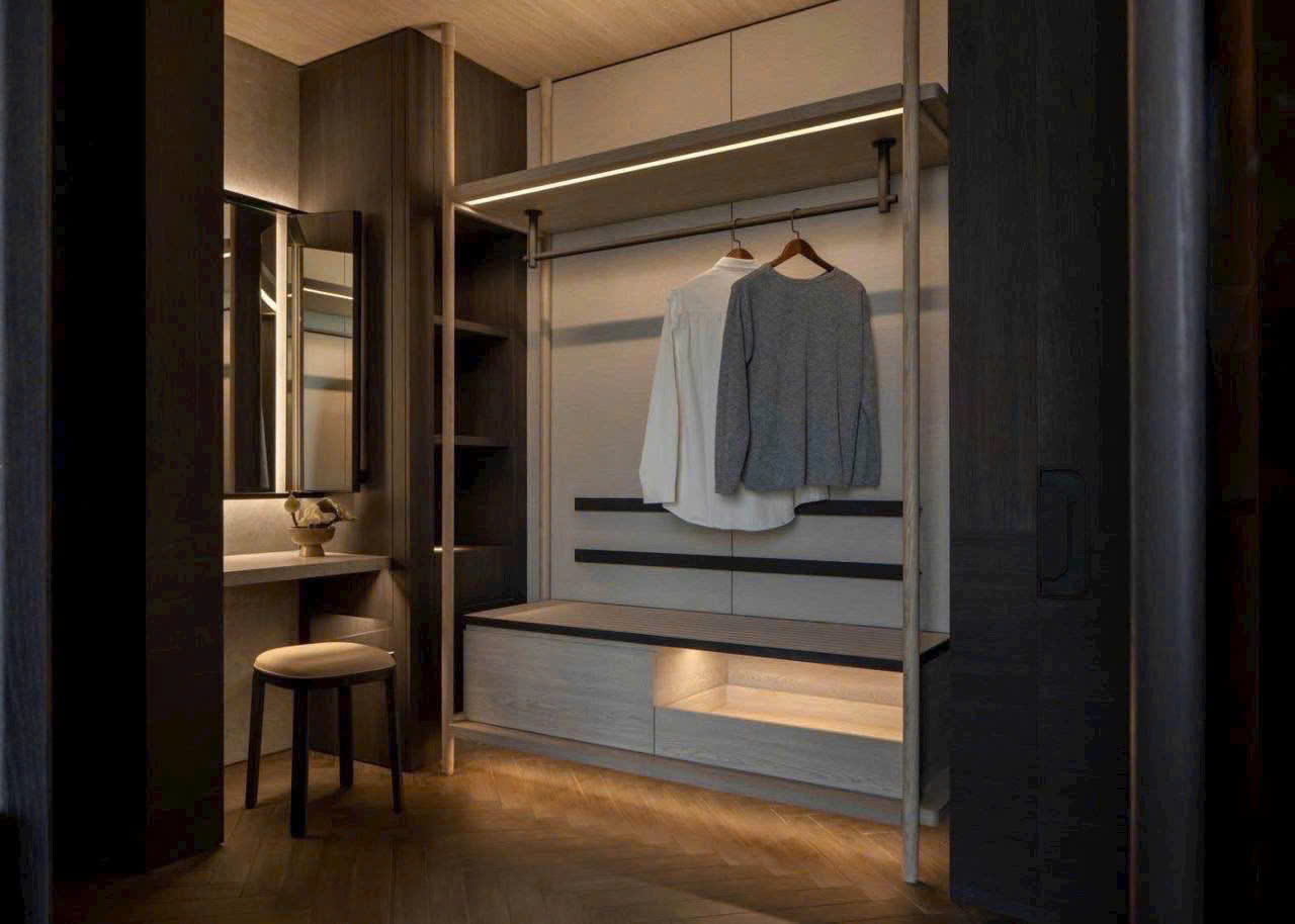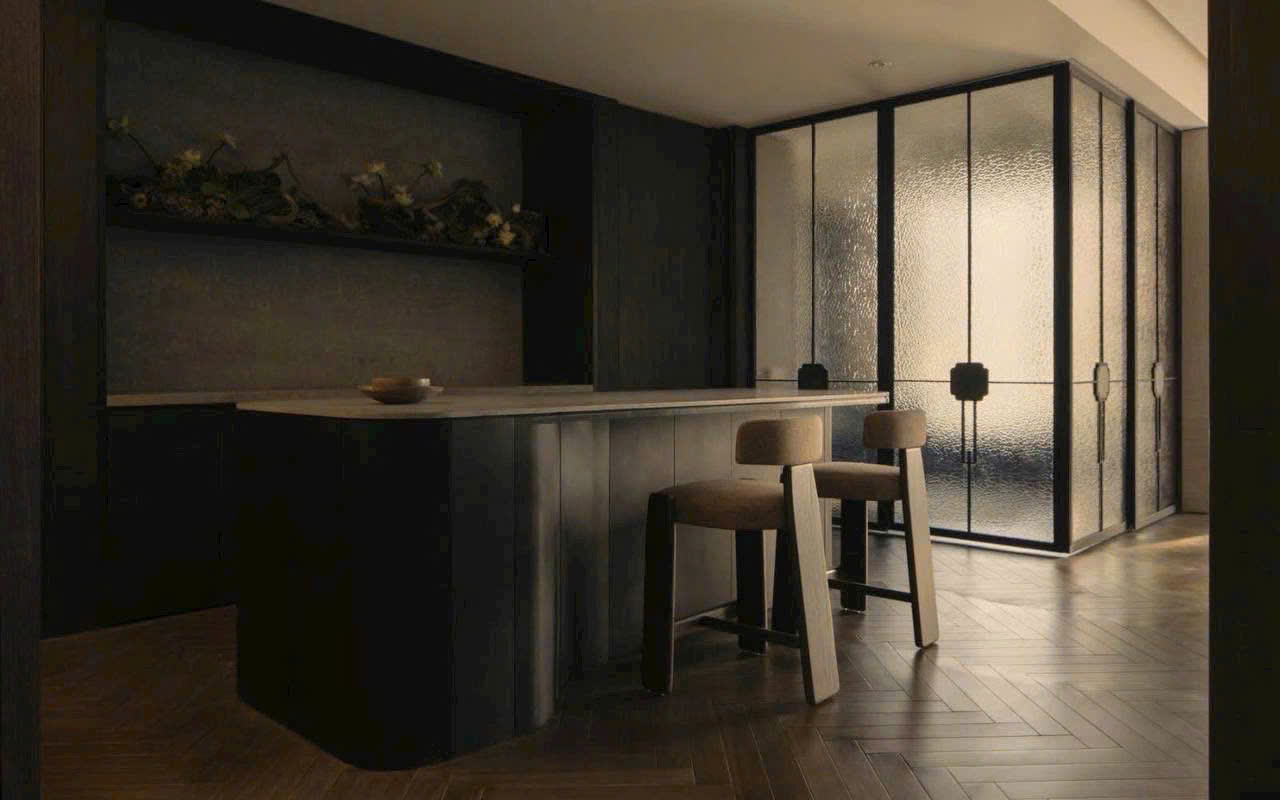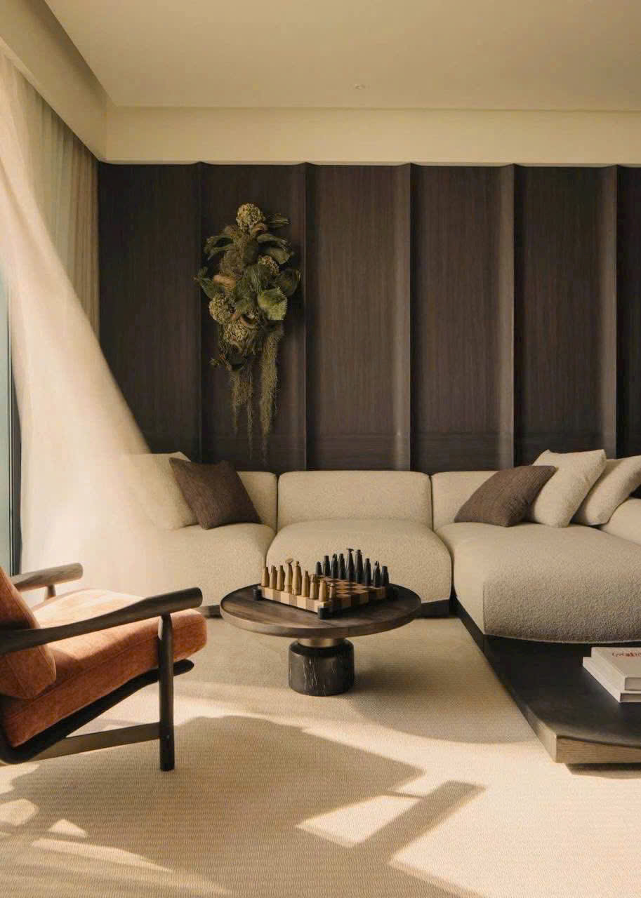 Với diện tích 159m², căn hộ sở hữu phòng khách rộng thoáng, liên kết trực tiếp với khu vực bàn ăn và bếp mở. Nội thất được đầu tư kỹ lưỡng với tông màu trầm ấm, chất liệu gỗ cao cấp và hệ thống chiếu sáng tinh tế, tạo cảm giác ấm cúng nhưng vẫn rất sang trọng.
