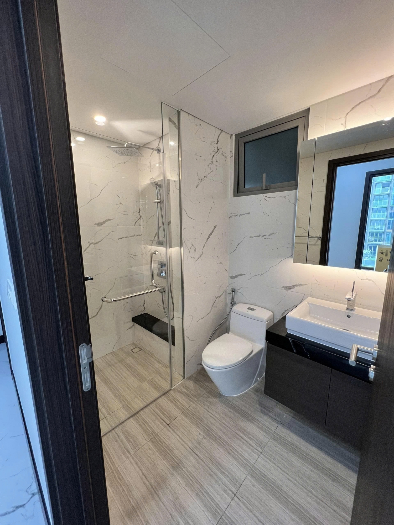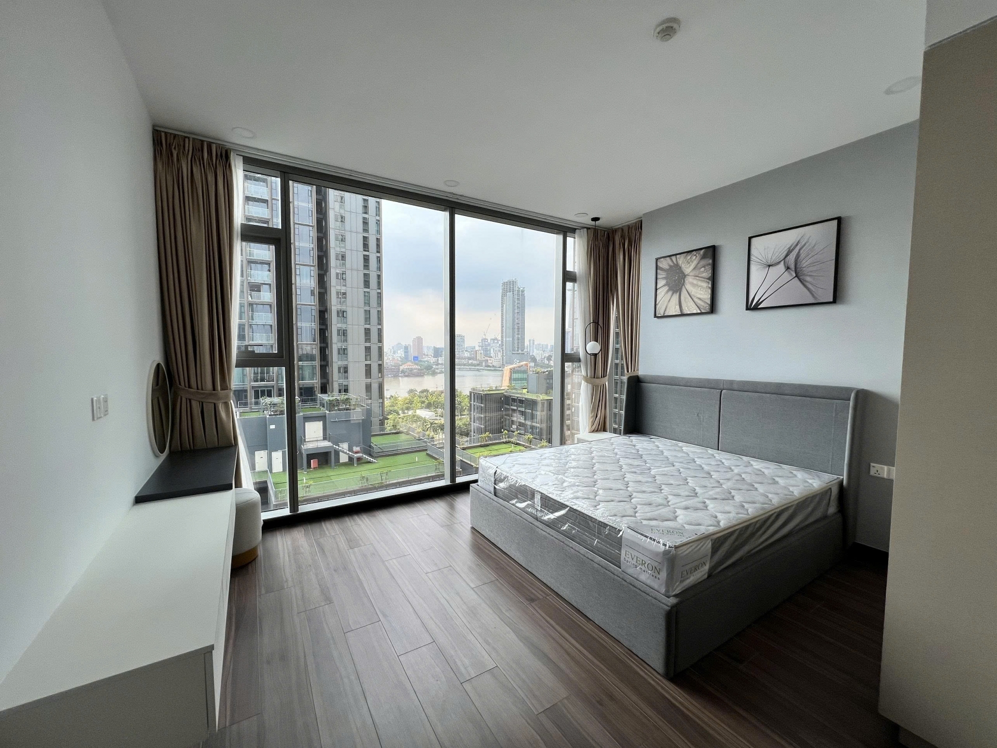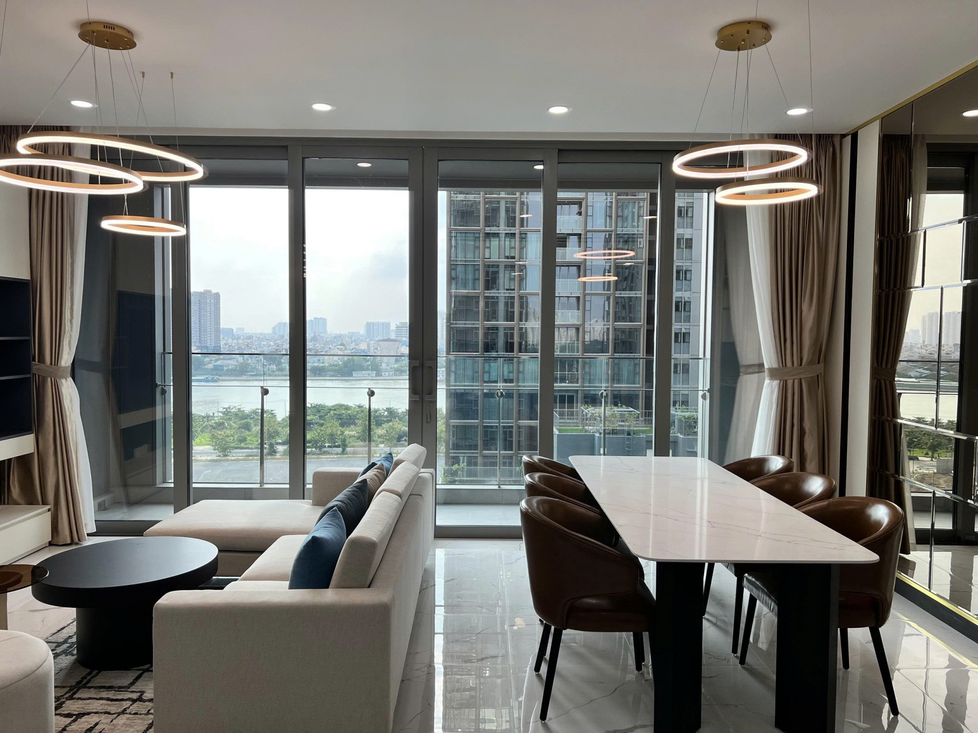 Căn hộ được thiết kế 3 phòng ngủ, không gian sinh hoạt rộng rãi với phòng khách liên thông khu bếp và bàn ăn, tạo cảm giác thoáng đãng và sang trọng. Hệ cửa kính lớn giúp căn hộ luôn tràn ngập ánh sáng tự nhiên và mở ra tầm nhìn sông Sài Gòn tuyệt đẹp, mang đến trải nghiệm sống thư thái và đẳng cấp mỗi ngày.