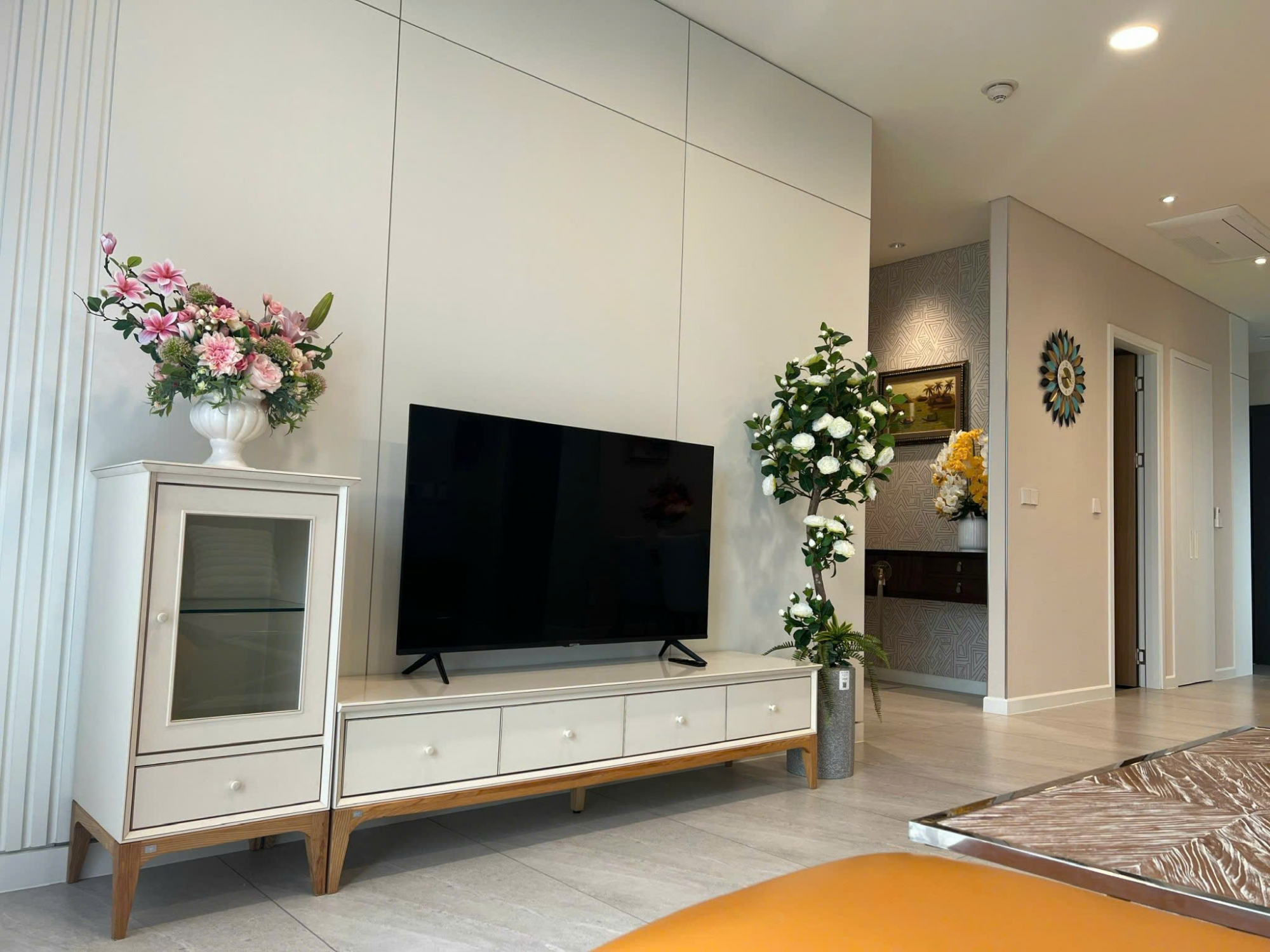 Căn hộ được trang bị đầy đủ nội thất hiện đại, cao cấp và đồng bộ như sofa, bàn ăn, giường, tủ, máy lạnh và hệ bếp hoàn chỉnh. Khách thuê chỉ cần mang vali vào ở ngay. Thiết kế tổng thể sang trọng, tông màu hài hòa, tạo cảm giác ấm cúng và đẳng cấp.