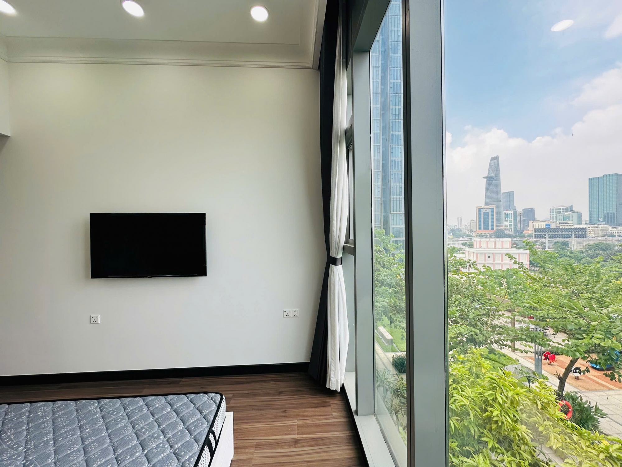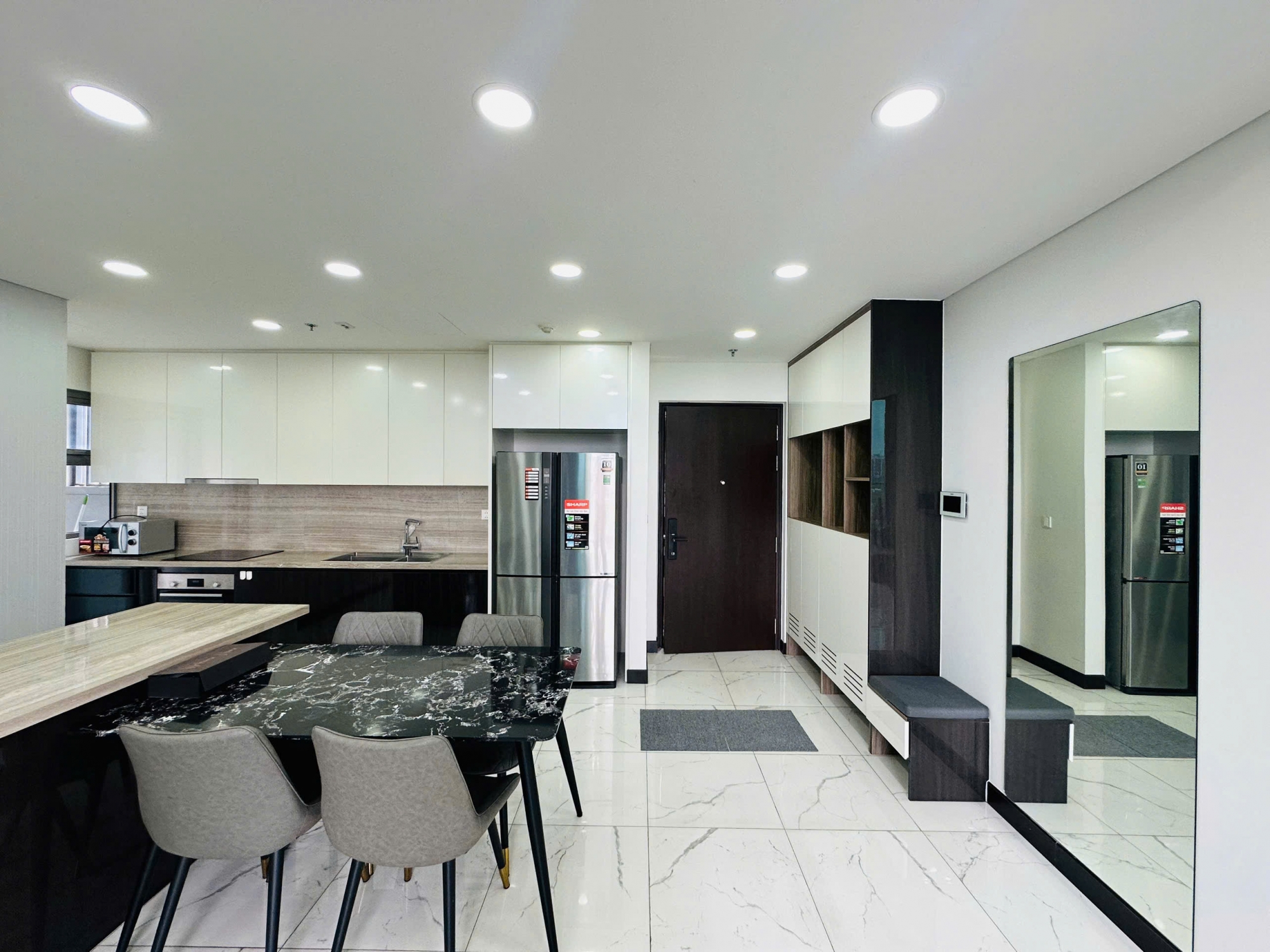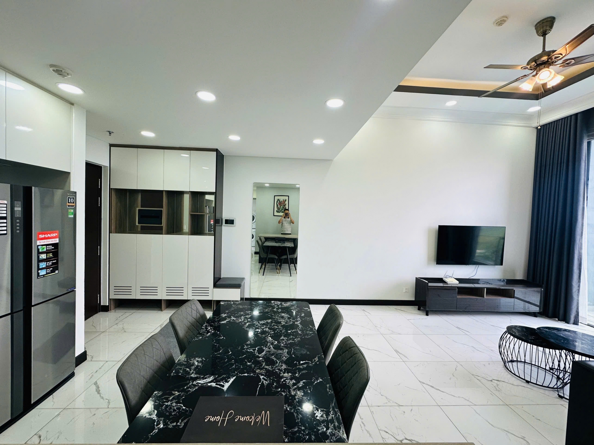 Căn hộ có diện tích 95m², bố trí gồm 2 phòng ngủ, không gian được thiết kế hợp lý giúp tối ưu công năng sử dụng và đảm bảo sự thoải mái trong sinh hoạt hằng ngày. Phòng khách rộng rãi, kết nối với khu bếp tạo thành không gian mở hiện đại. Toàn bộ căn hộ được trang bị full nội thất, thiết kế tinh tế, mang lại cảm giác ấm cúng nhưng vẫn rất sang trọng.
