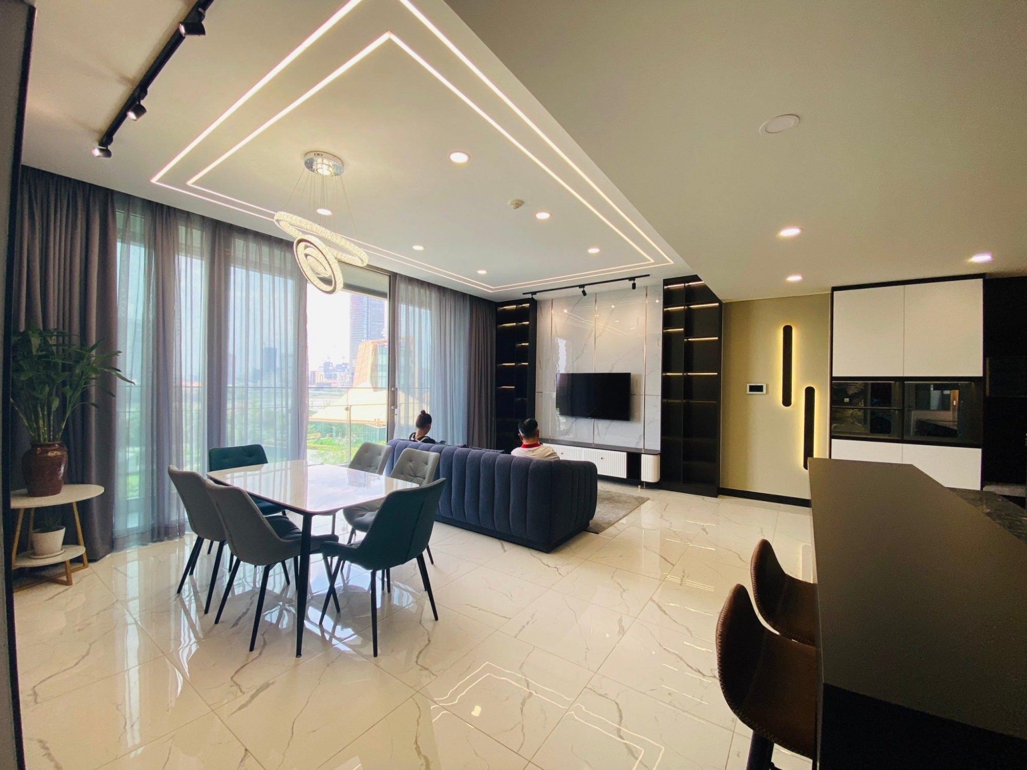 The unit is fully furnished with premium materials and designer finishes. Highlights include built-in cabinetry, a marble kitchen island, modern lighting systems, and high-quality appliances. The neutral color palette combined with sophisticated interior details delivers a warm yet luxurious atmosphere.