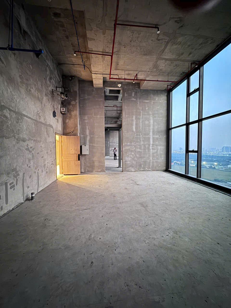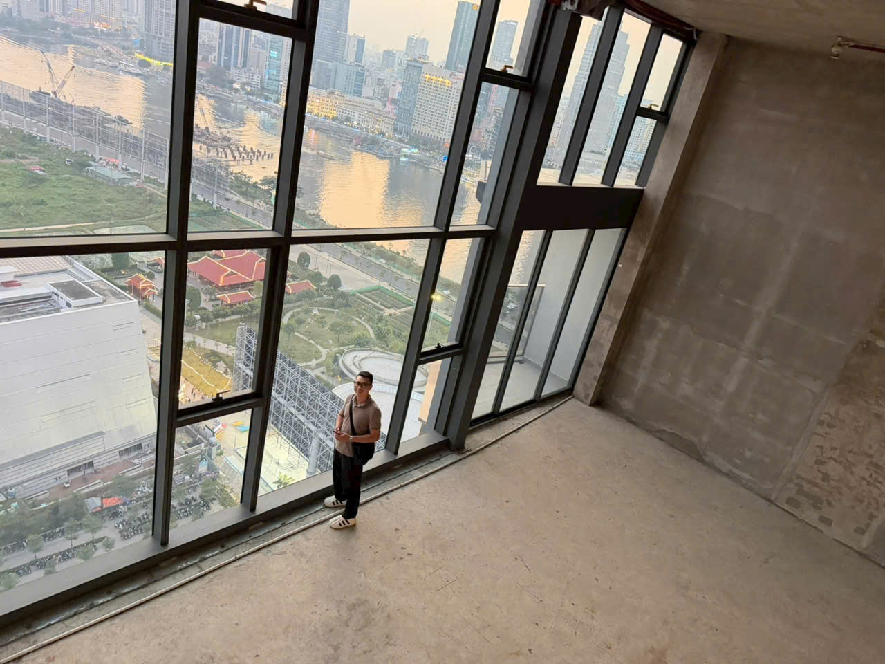 The penthouse features a duplex layout with soaring ceilings, floor-to-ceiling glass walls, and uninterrupted panoramic views of the Saigon River and the iconic skyline of District 1.