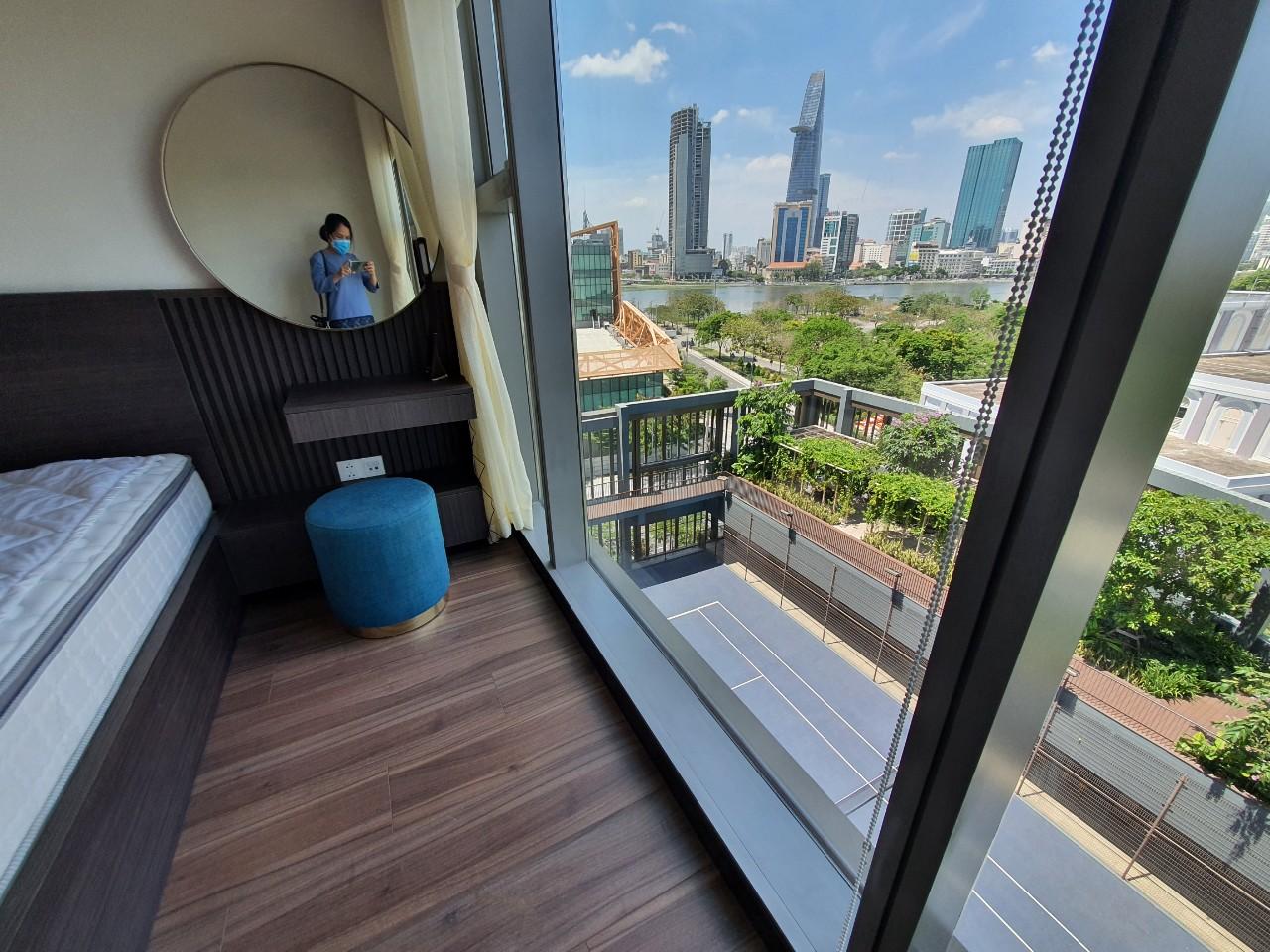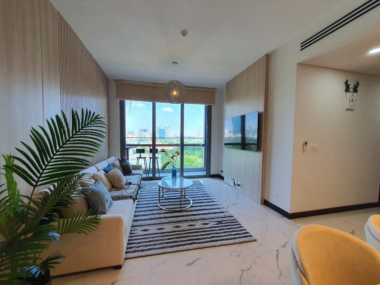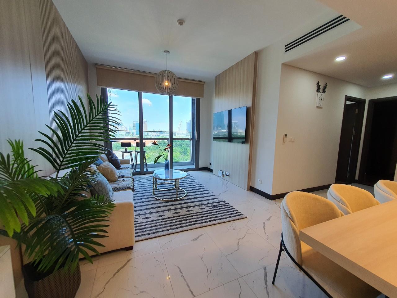 The apartment features two spacious bedrooms with a modern and well planned layout. The living room is elegantly designed with a comfortable sofa, stylish coffee table, and decorative elements that create a warm and inviting living space. One of the most impressive highlights of the apartment is its panoramic view of the Saigon River and District 1 skyline. From the balcony, residents can enjoy breathtaking scenery both during the day and at night.