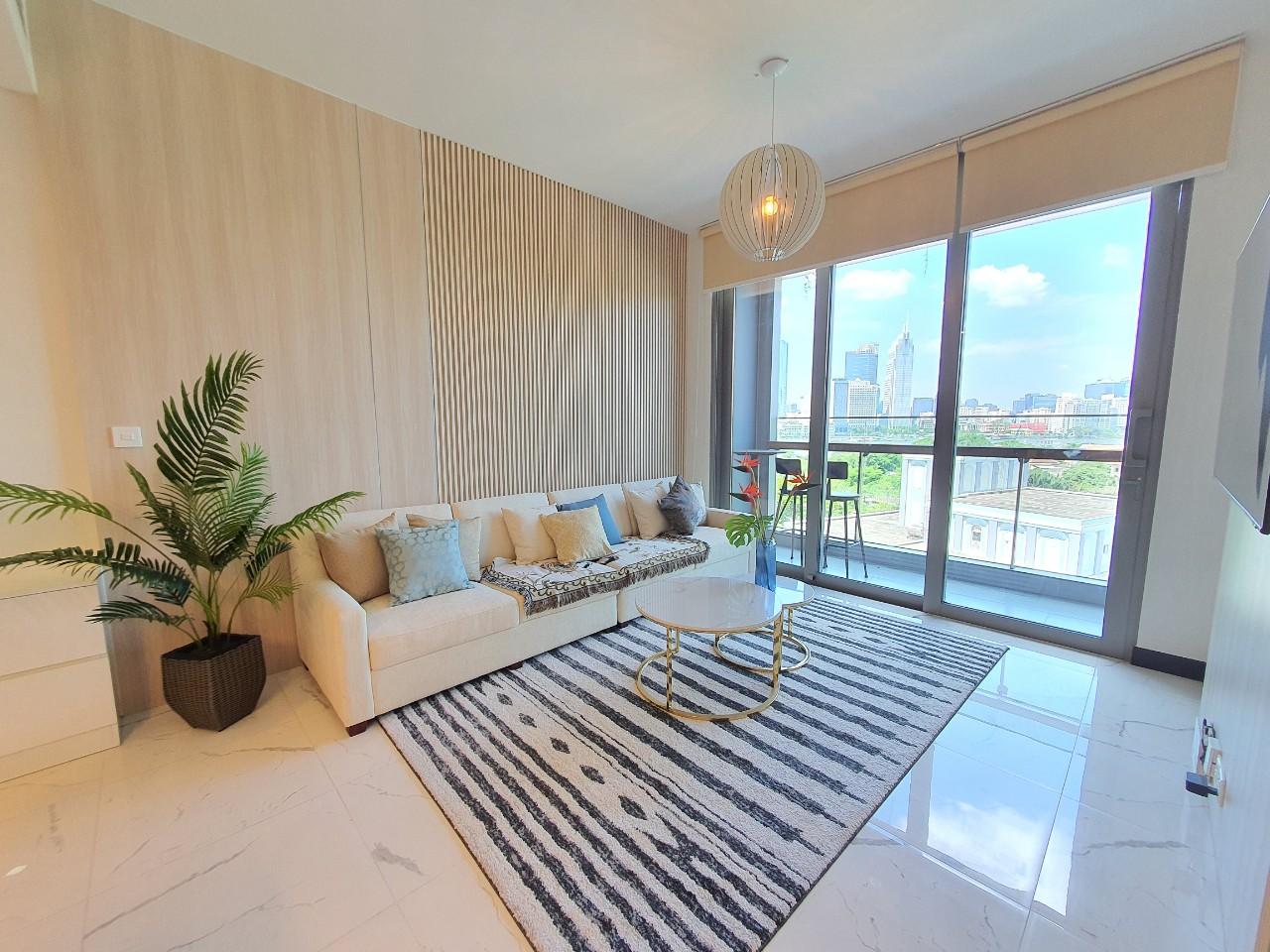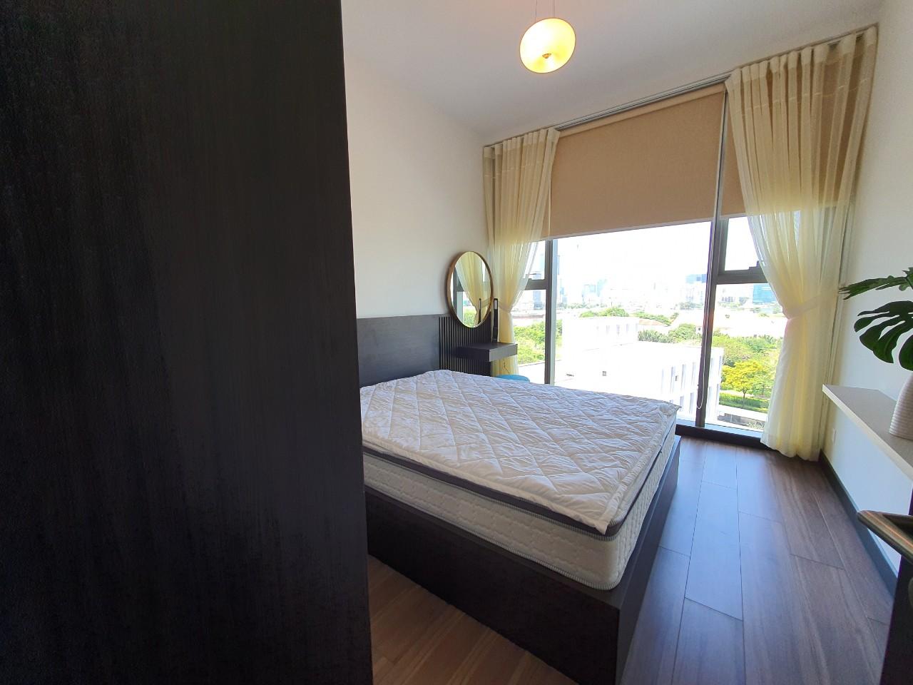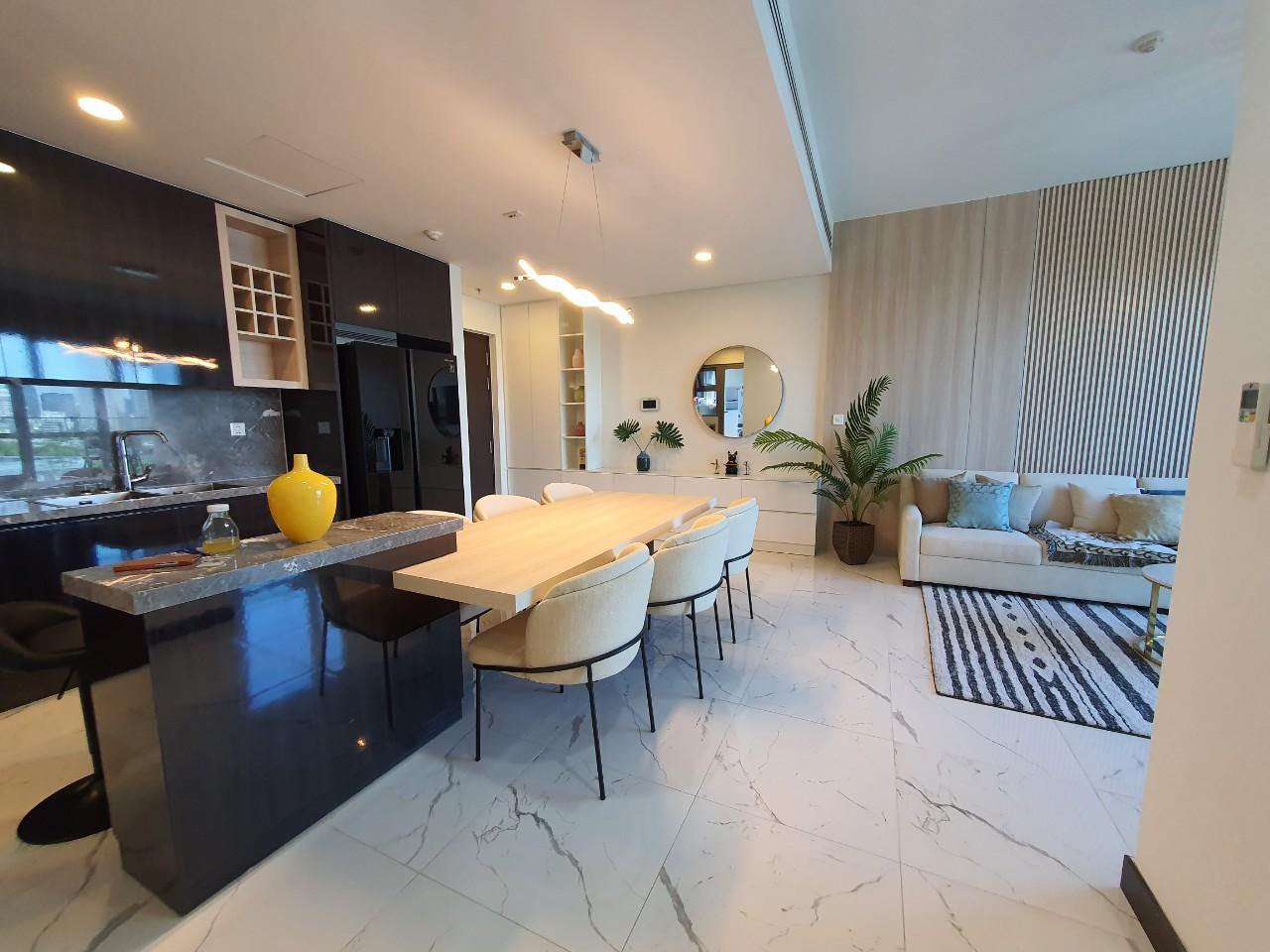 The apartment features two spacious bedrooms with a modern and well planned layout. The living room is elegantly designed with a comfortable sofa, stylish coffee table, and decorative elements that create a warm and inviting living space. One of the most impressive highlights of the apartment is its panoramic view of the Saigon River and District 1 skyline. From the balcony, residents can enjoy breathtaking scenery both during the day and at night.