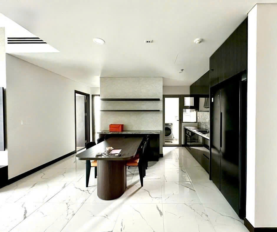 The living area is neatly arranged and connected to a spacious balcony with floor-to-ceiling windows, allowing abundant natural light and a relaxing riverside panorama. The kitchen and dining area are designed in a modern, functional style, ideal for daily living as well as entertaining guests.